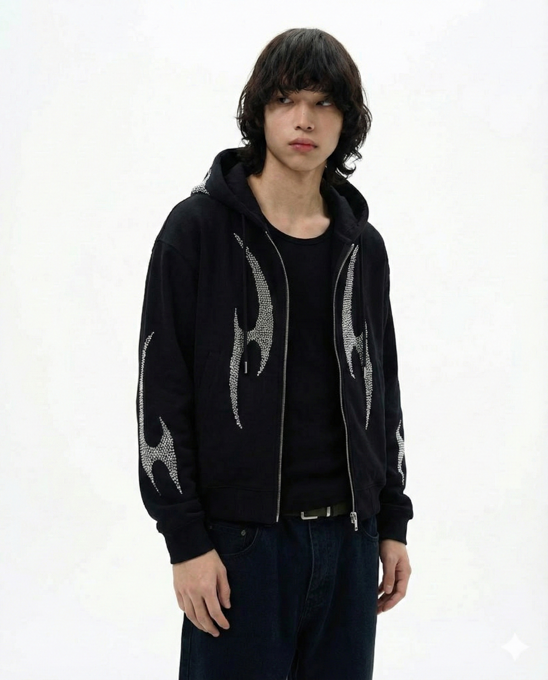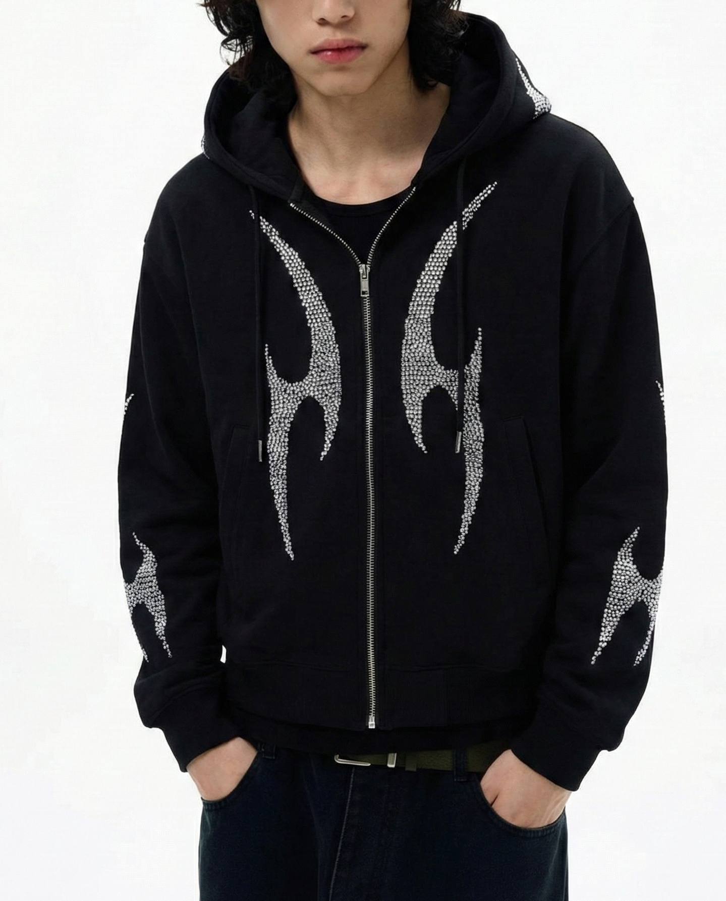 ブラックベースにシルバーのグラフィックを大胆に落とし込んだジップフーディ。