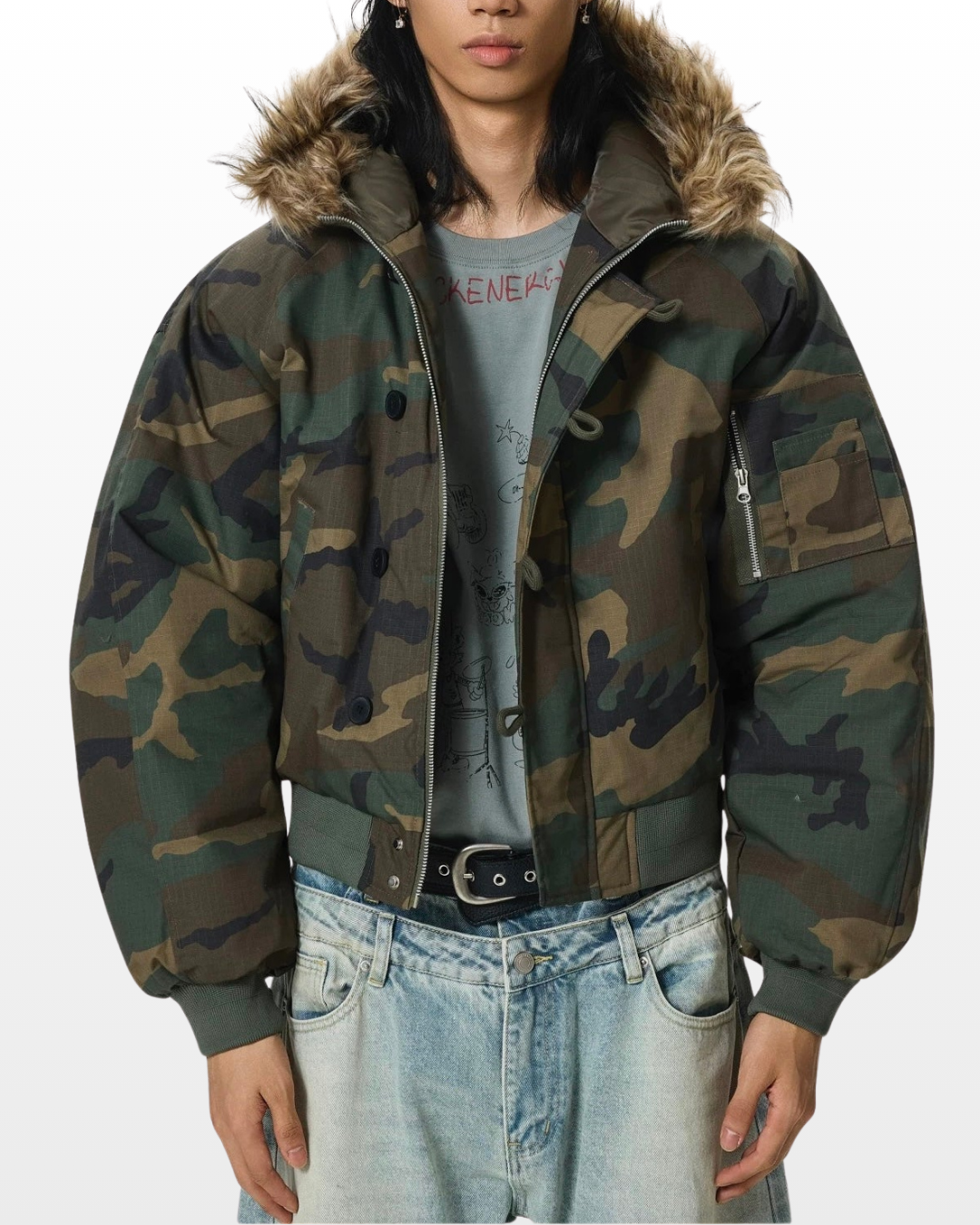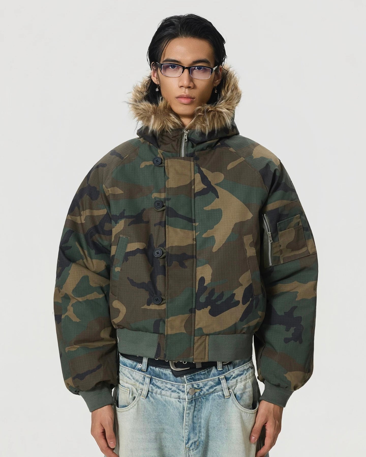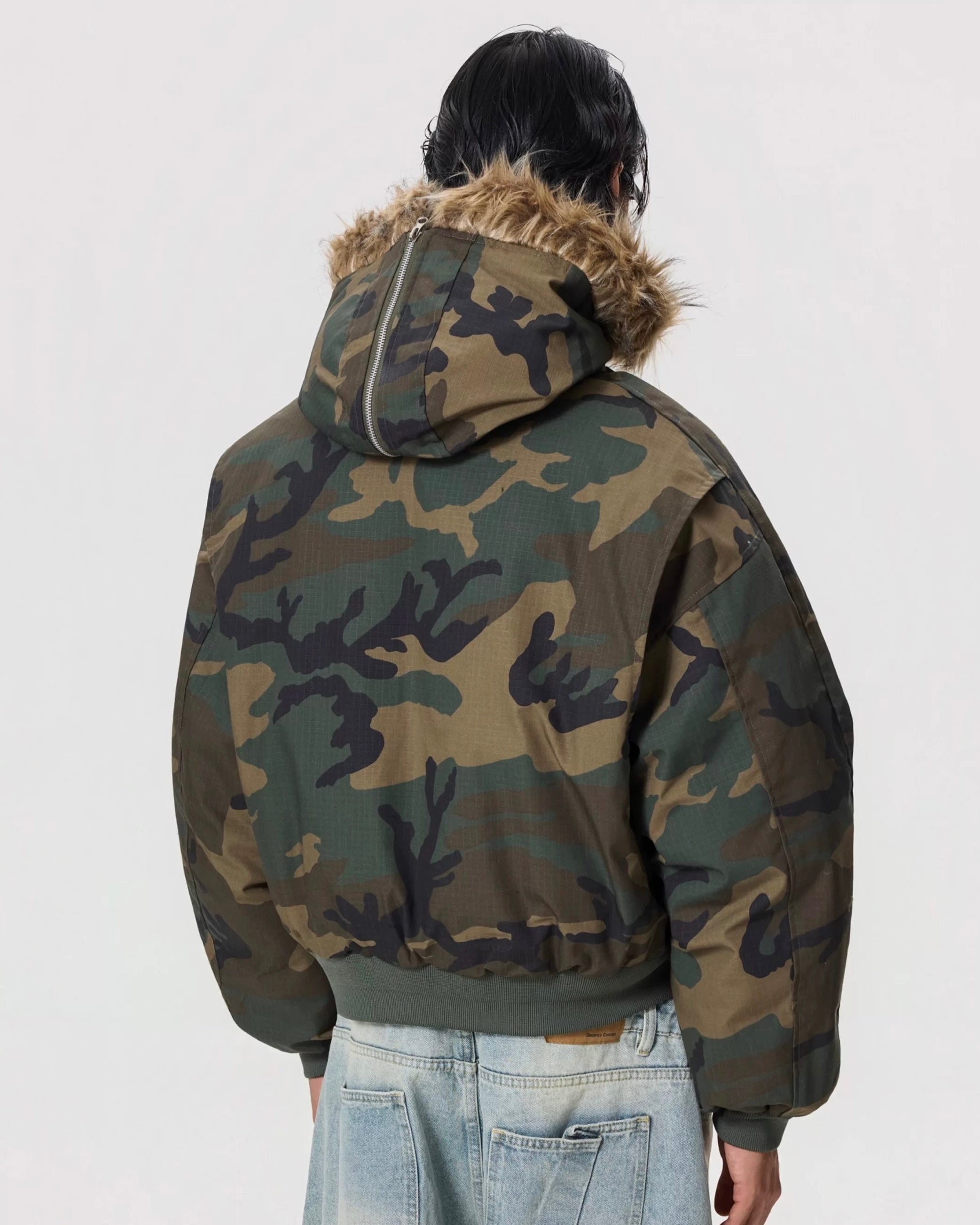 クラシックなウッドランドカモに、ファーフードを掛け合わせた一着。
