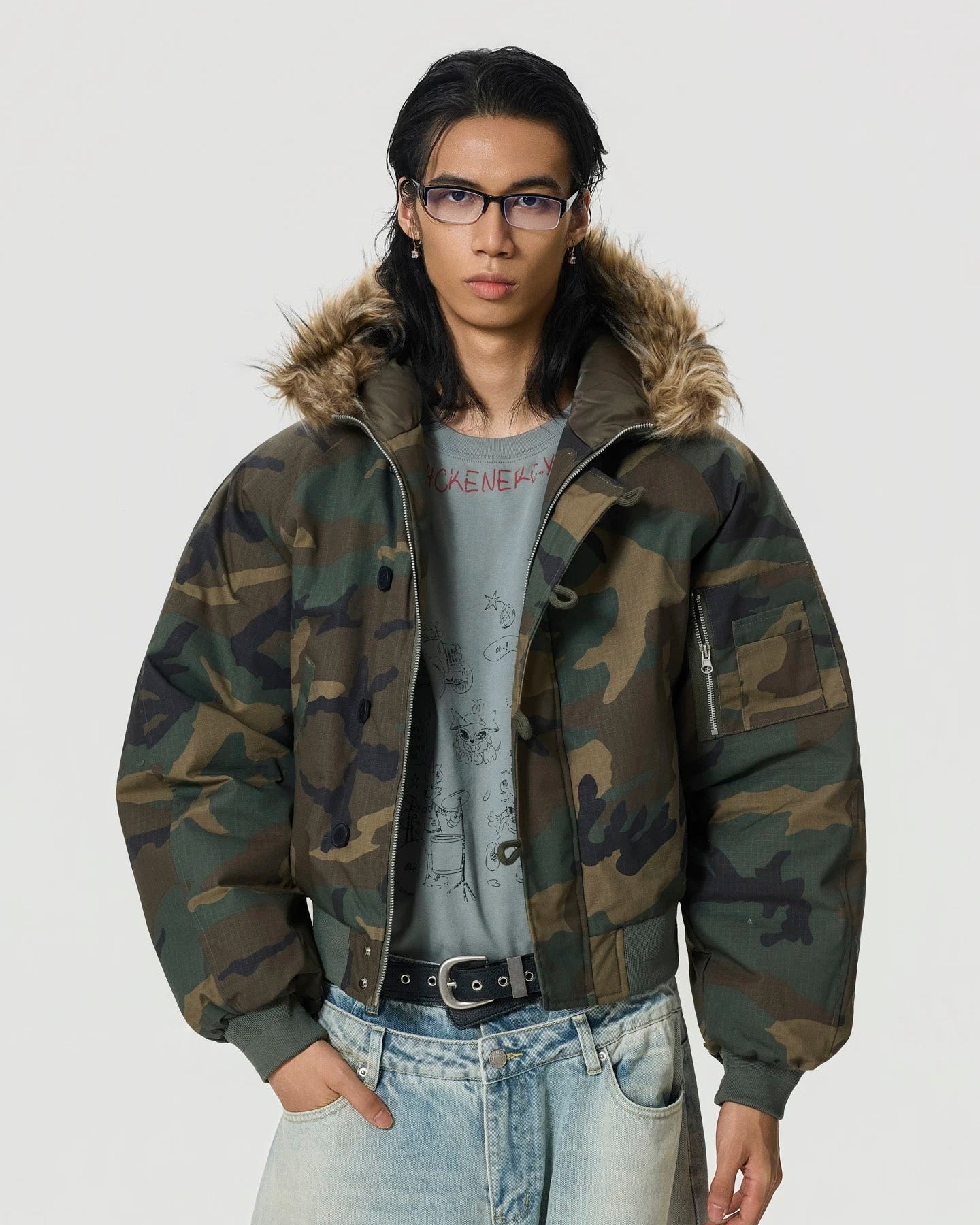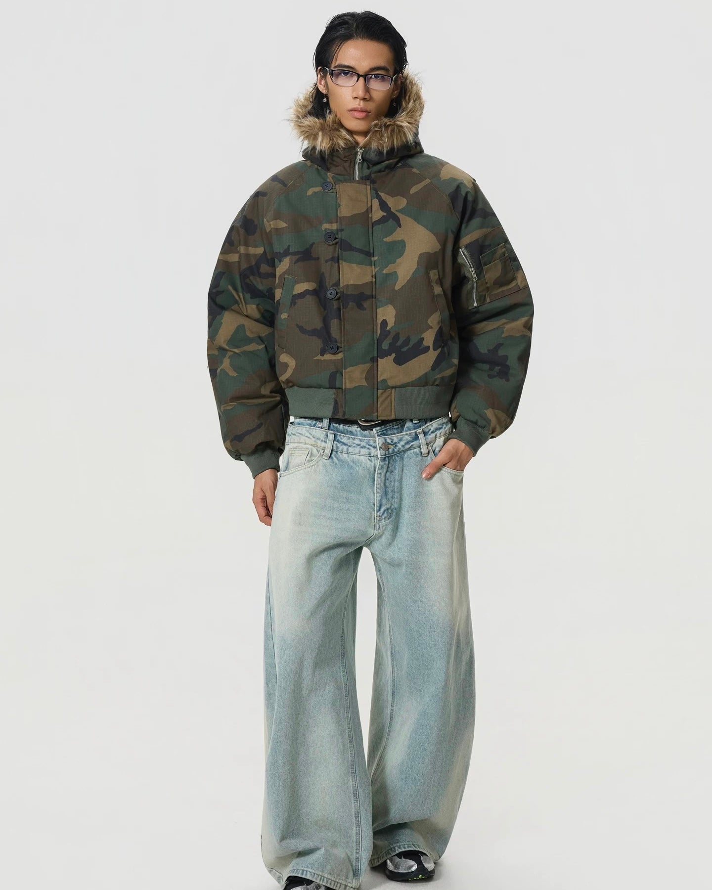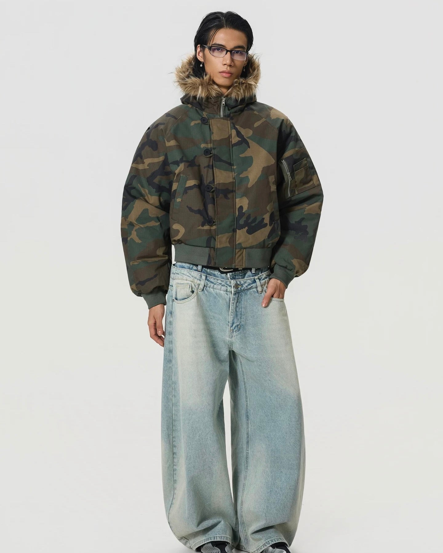 クラシックなウッドランドカモに、ファーフードを掛け合わせた一着。
