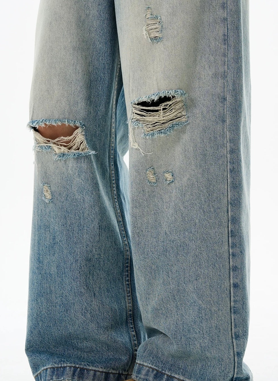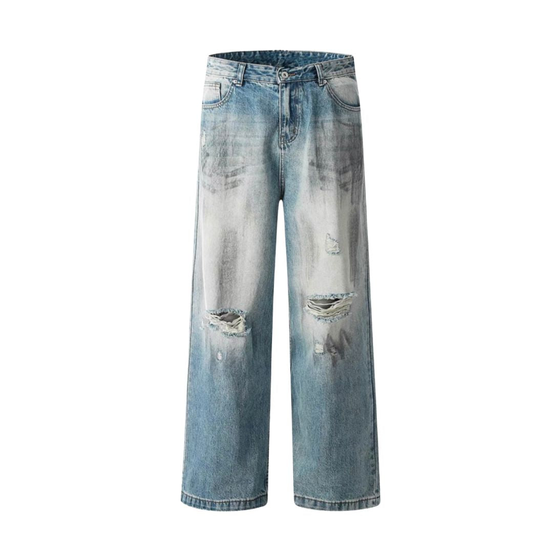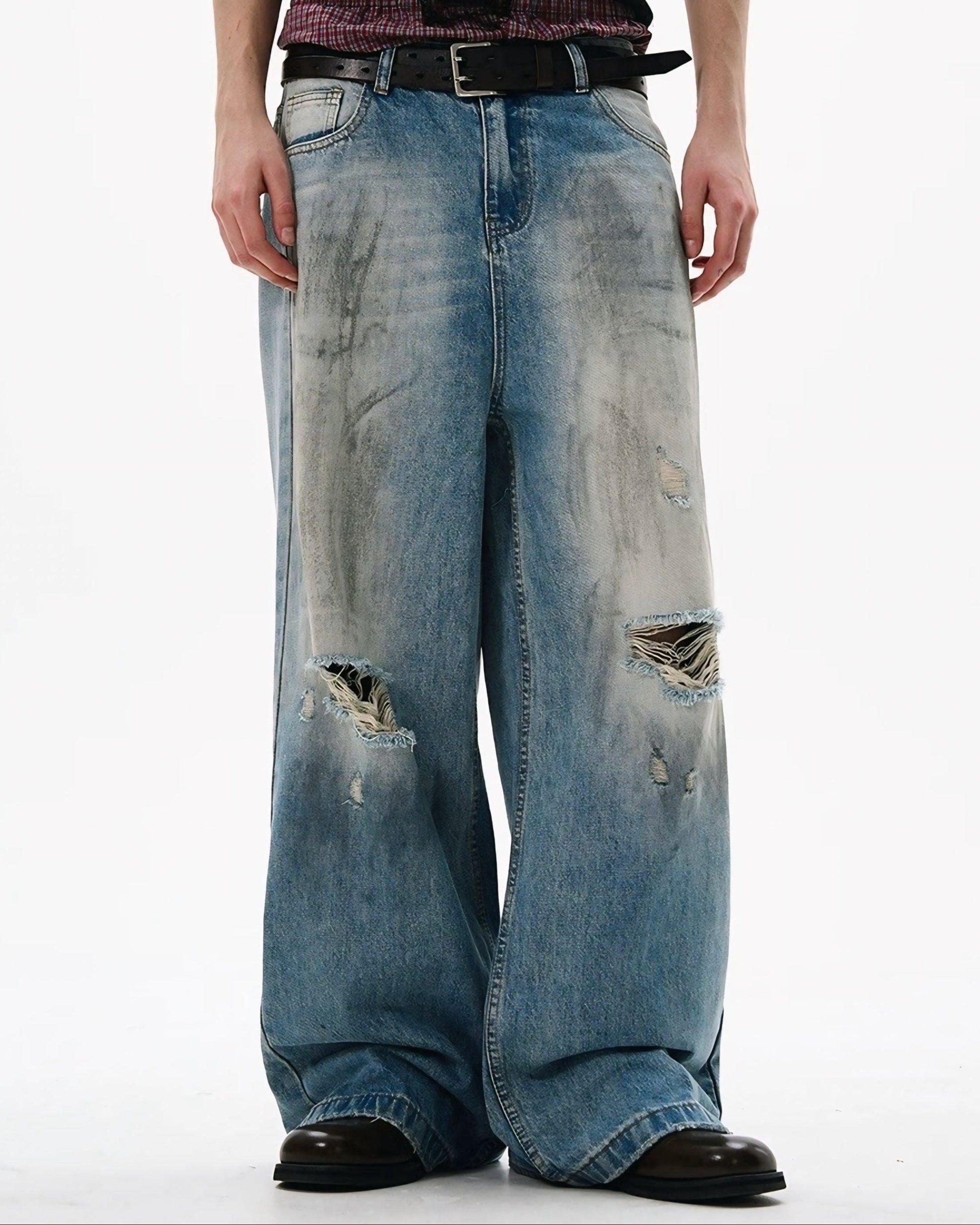 極太シルエットに、激しめのウォッシュとダメージ加工を落とし込んだワイドデニム。