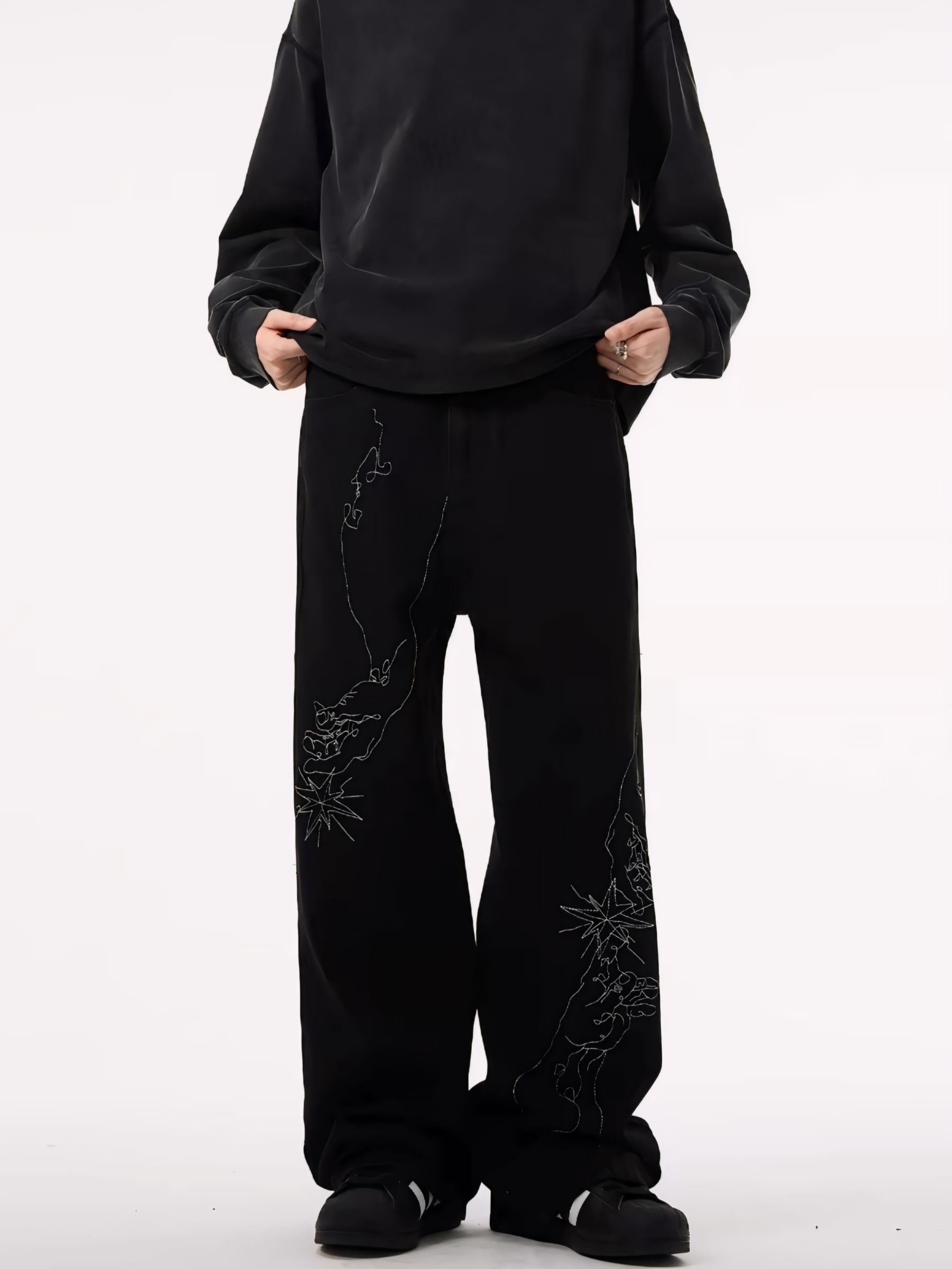 ブラックベースにライン刺繍が入ったワイドパンツ。
