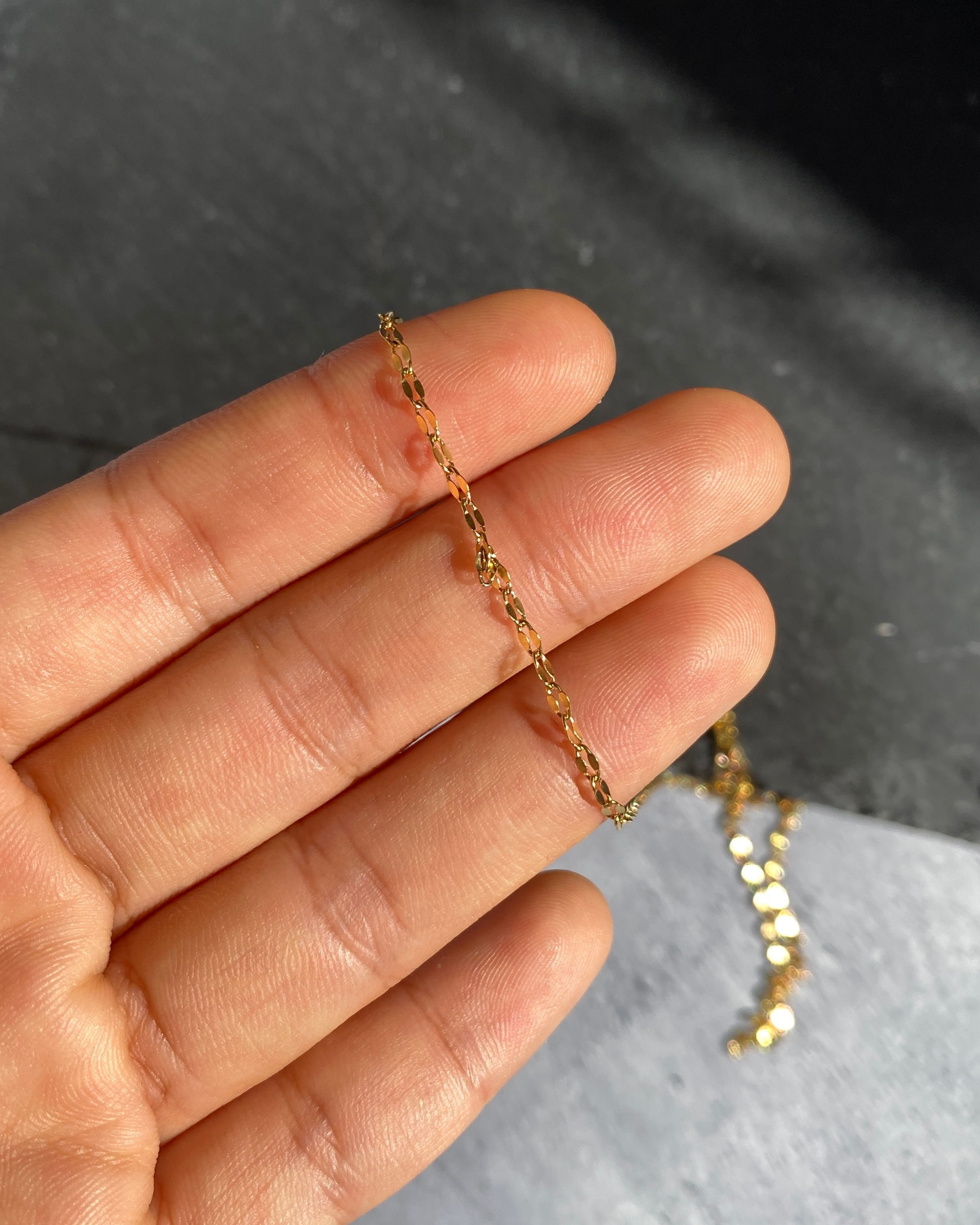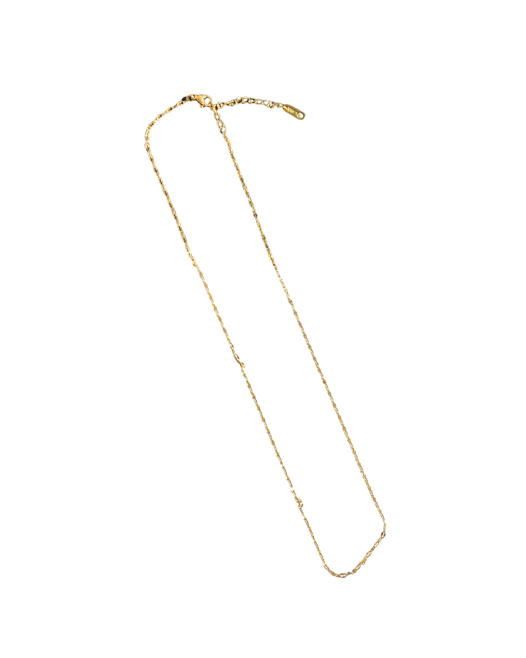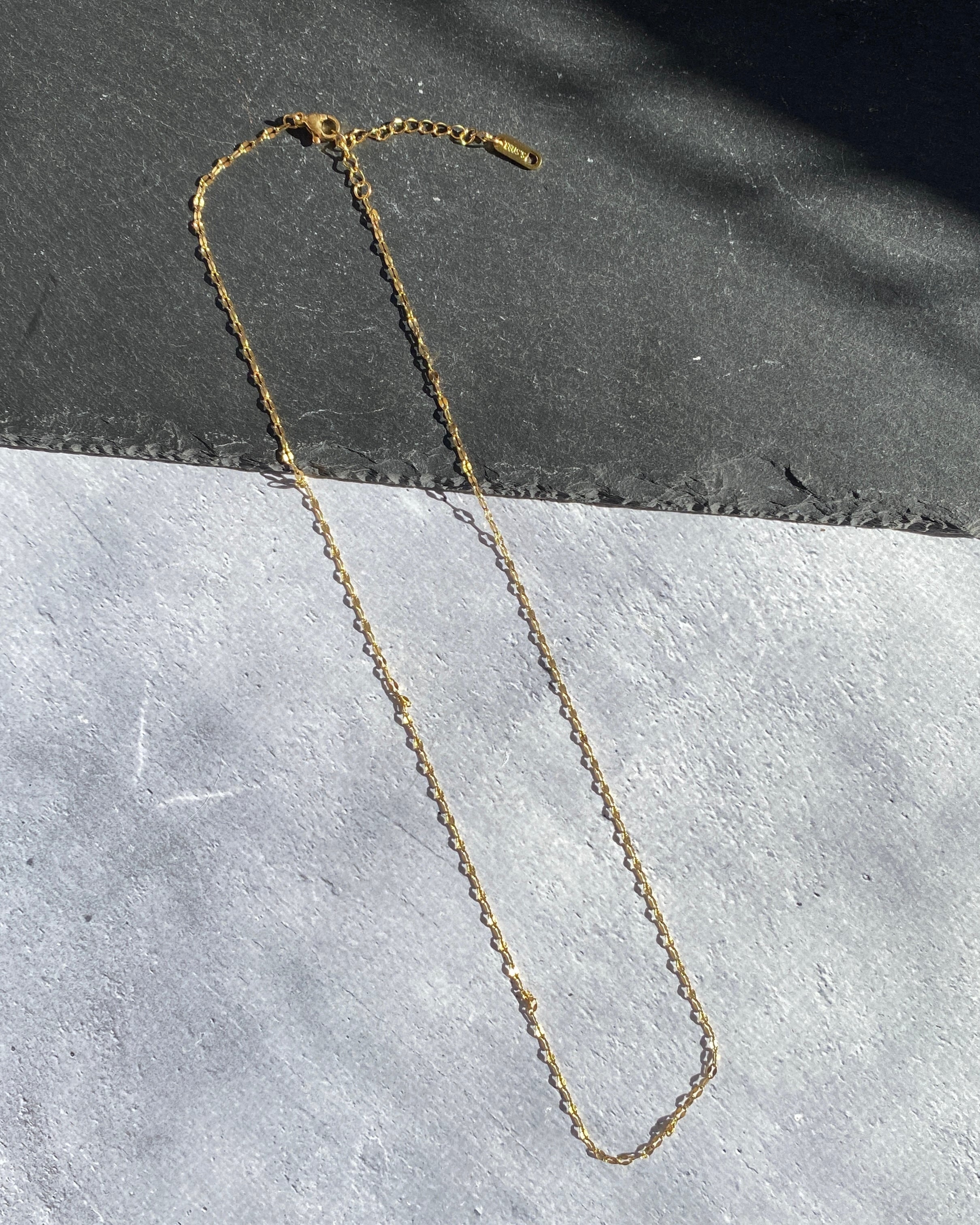 チェーンのみのシンプルなデザインで、他のネックレスと重ねづけしてもお互いのデザインを邪魔しません。