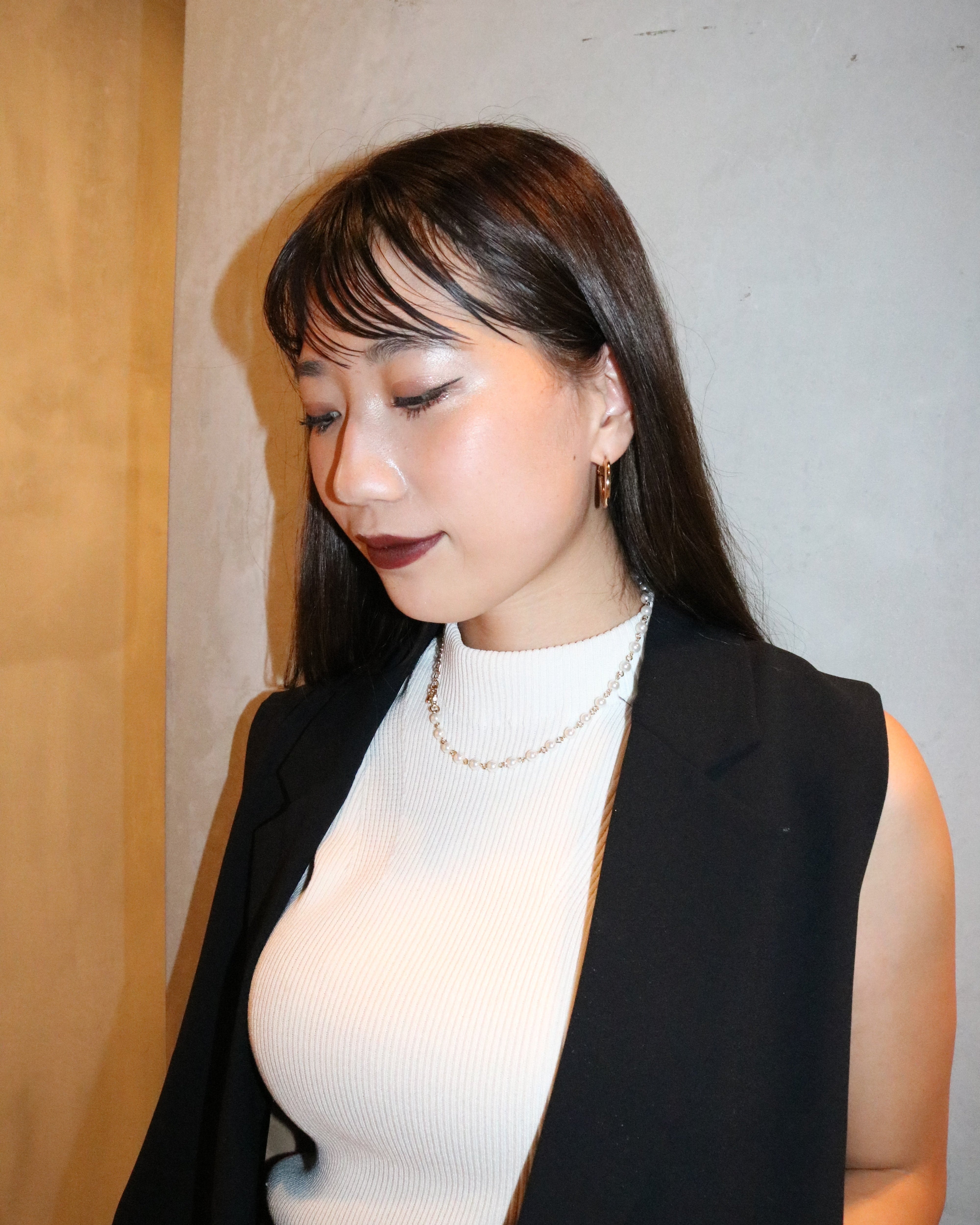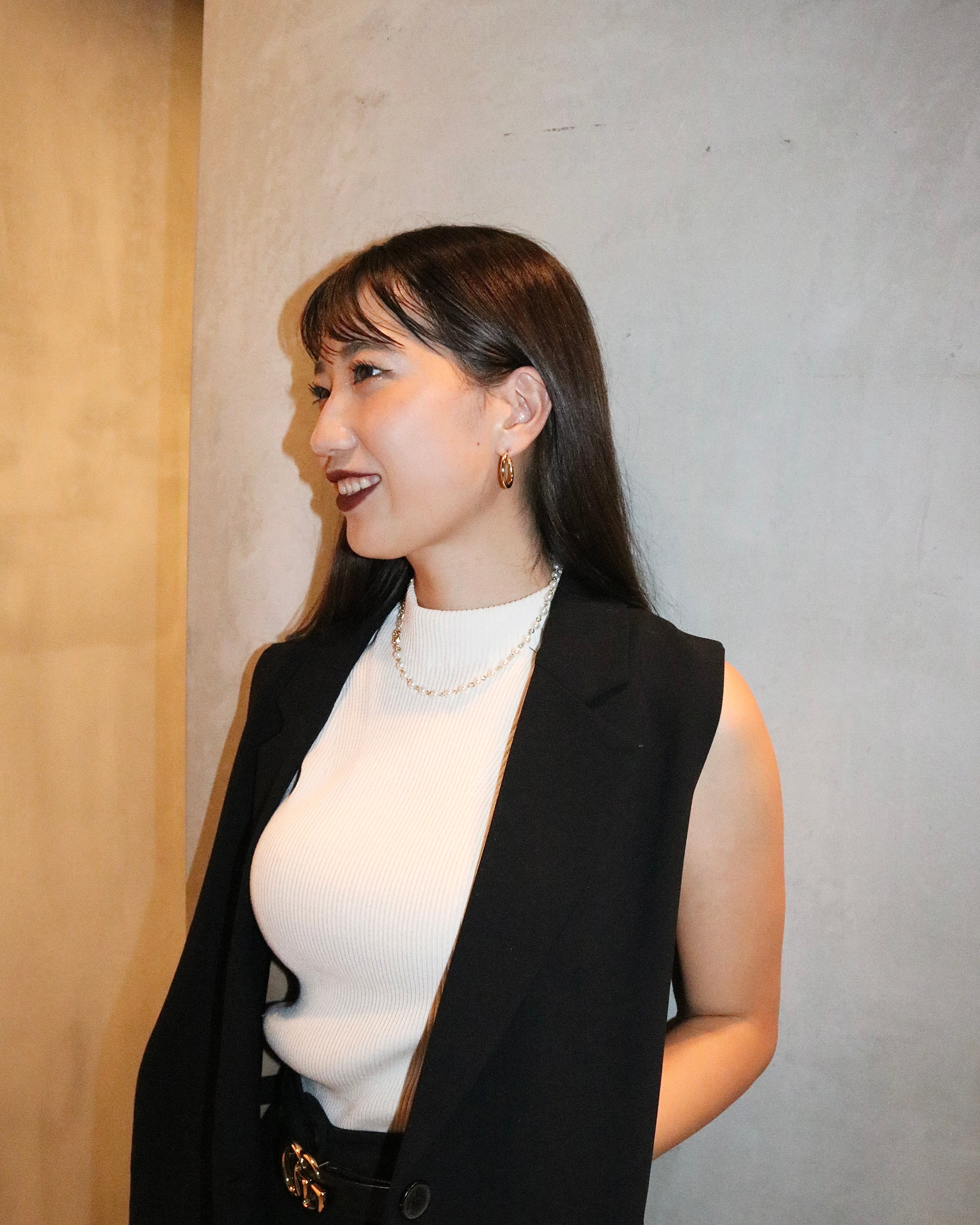 胸元にさりげなくワンポイントとしてつけるのがおすすめ。